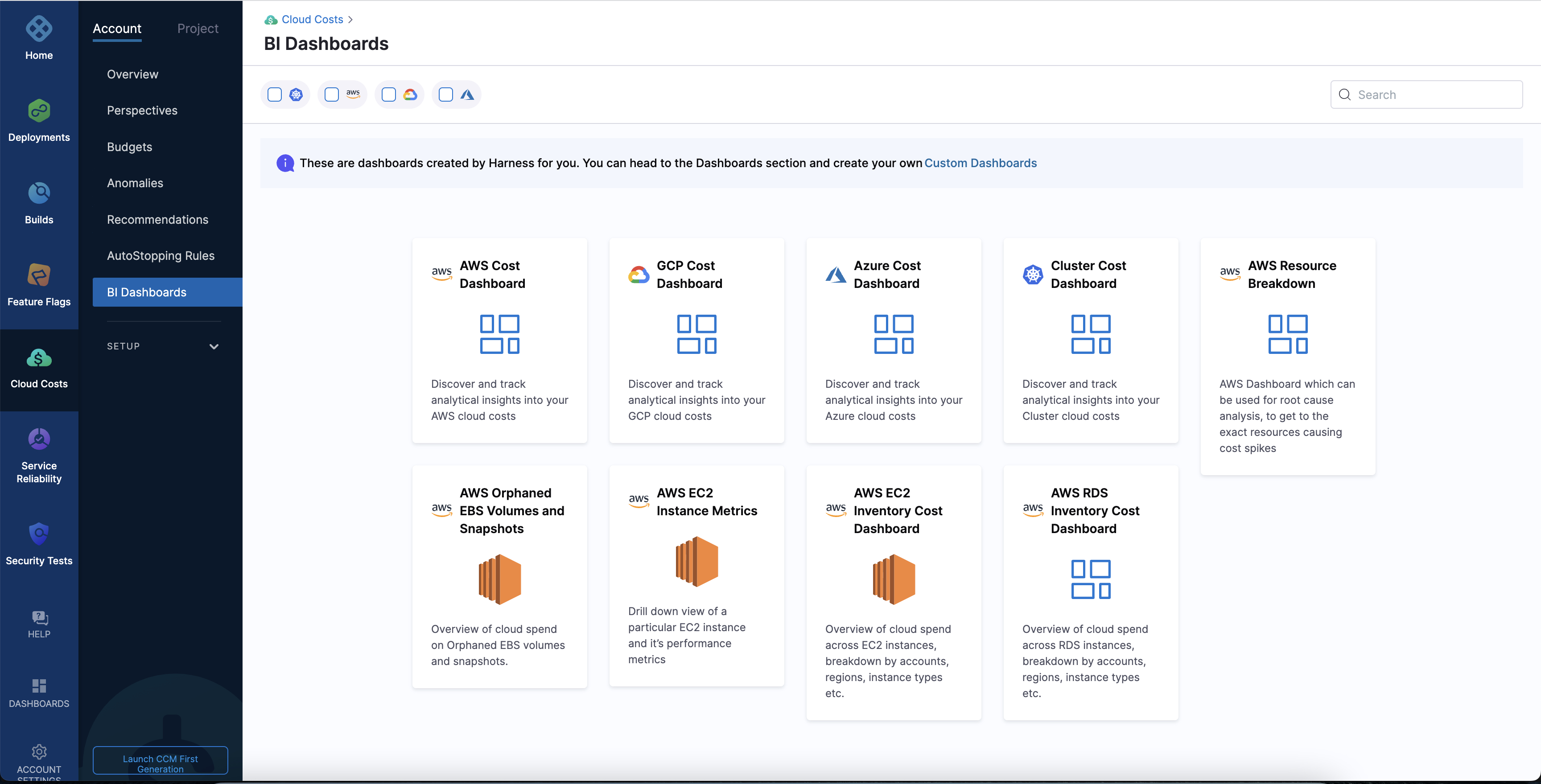 3. Select the cloud provider to view the dashboards available for the specific cloud provider.