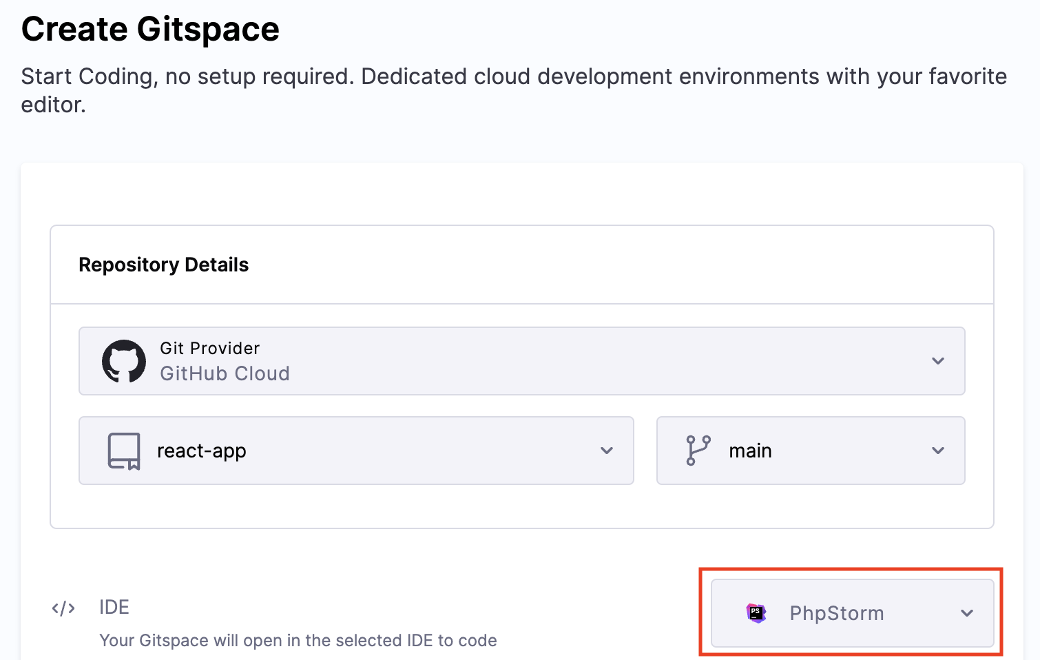 Select "PhpStorm" as the IDE during Gitspace creation.