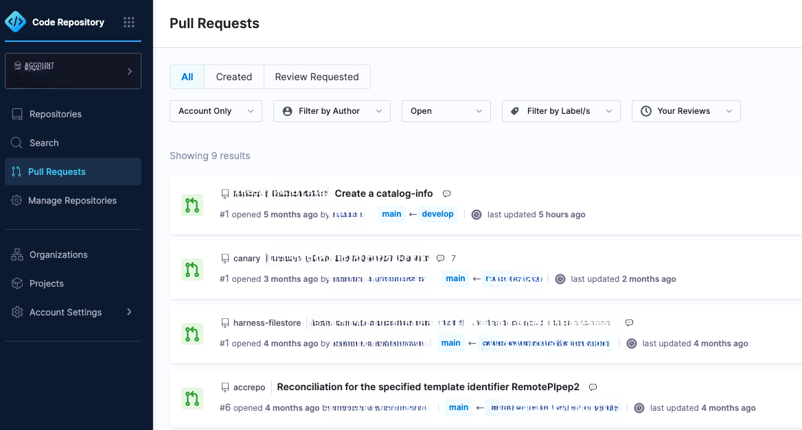 The PR Dashboard provides a complete view of pull requests across the selected scope—Account, Organization, or Project—regardless of author. This enables teams to track all ongoing work, not just PRs tied to the current user.