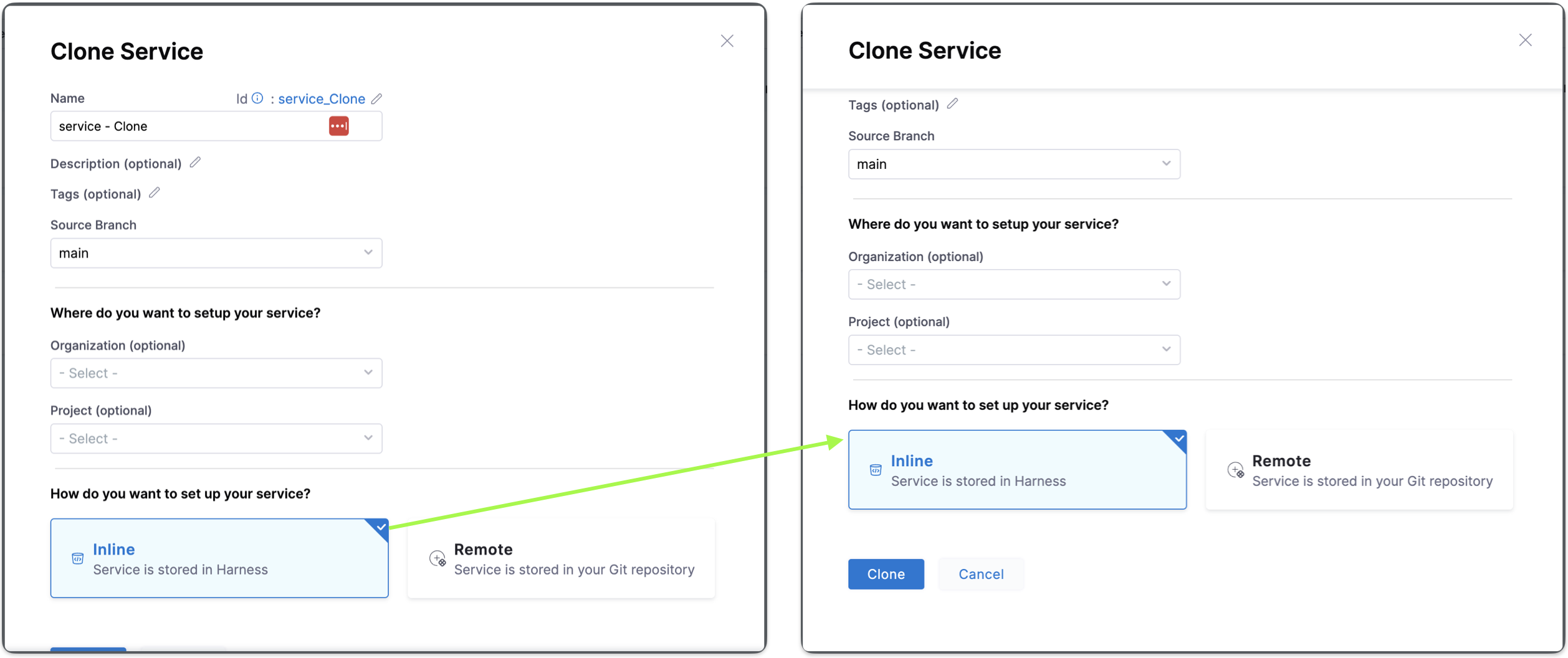 You can choose between Inline and Remote to set up your service. Choose Inline when you want your service to be stored in Harness. Choose Remote when storing your service in a Third-party Git repository or Harness Code Repository.