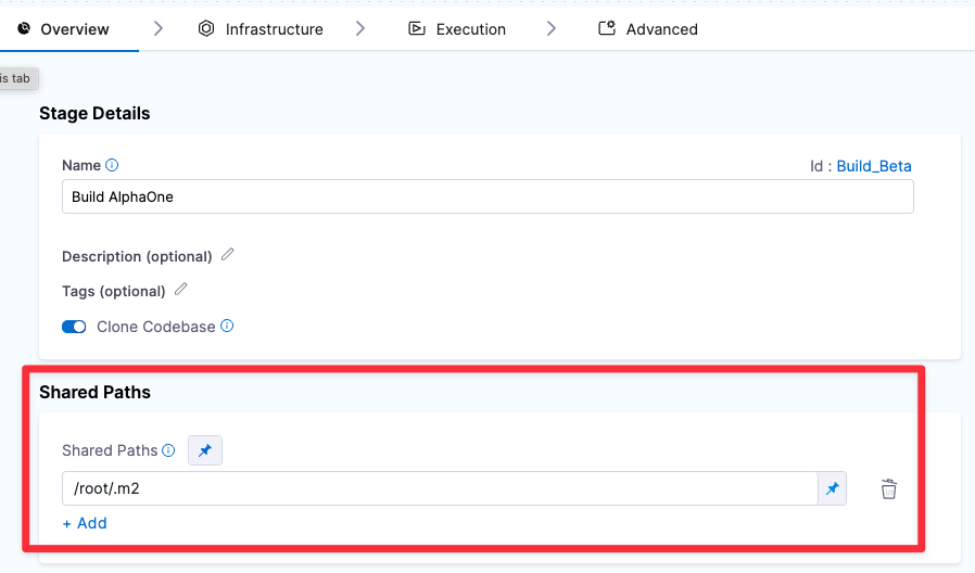 For example, the maven m2 repo is stored in /root/.m2 by default, which is outside the /harness directory. If your Build stage uses Maven, you can specify /root/.m2 as a Shared Path so that all steps in that stage can access that directory.