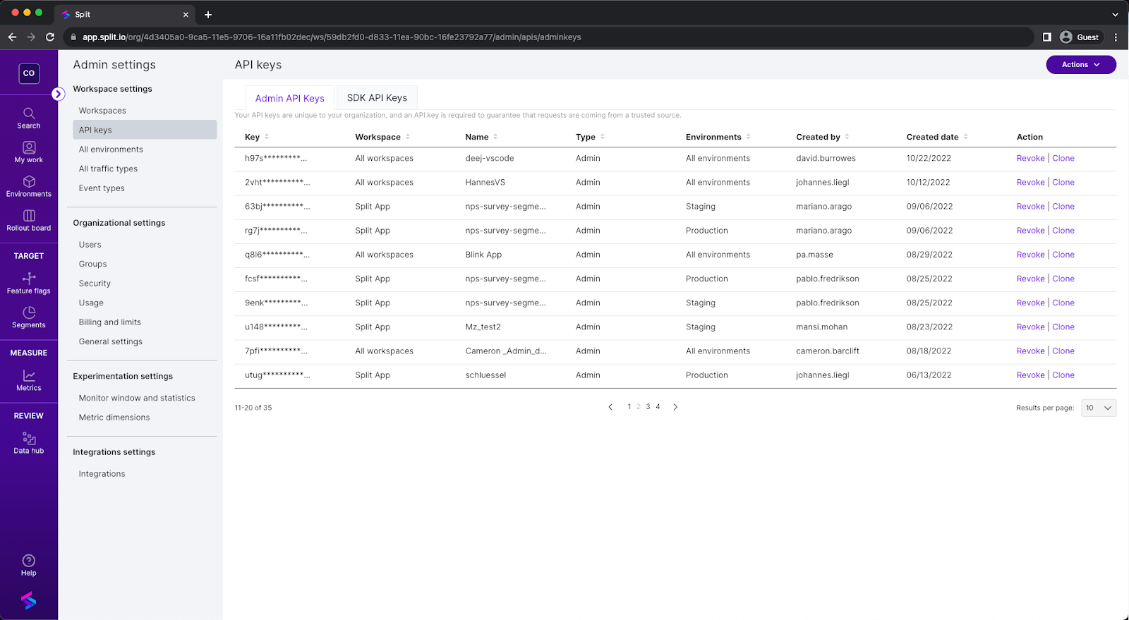To manage your API keys, go to the API keys tab in your Admin Settings page. On this page you can: