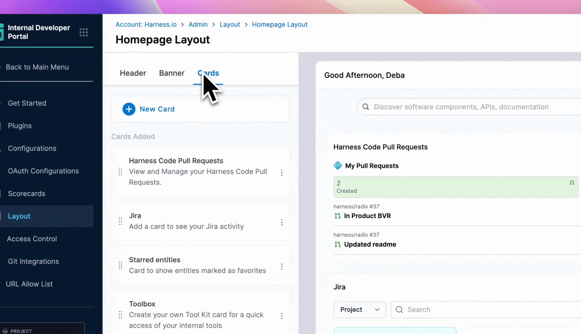 Homepage of IDP is meant to provide personalized view for developers, serving as a single pane of glass for all the necessary information required across tools and software systems in use, and it differs for different organization as well as different teams in an organization. So to help with varied use-cases, you can customize the homepage, add quick links in the headers, change text on the header, banner and cards according to your engineering org and make it useful for your developers.
