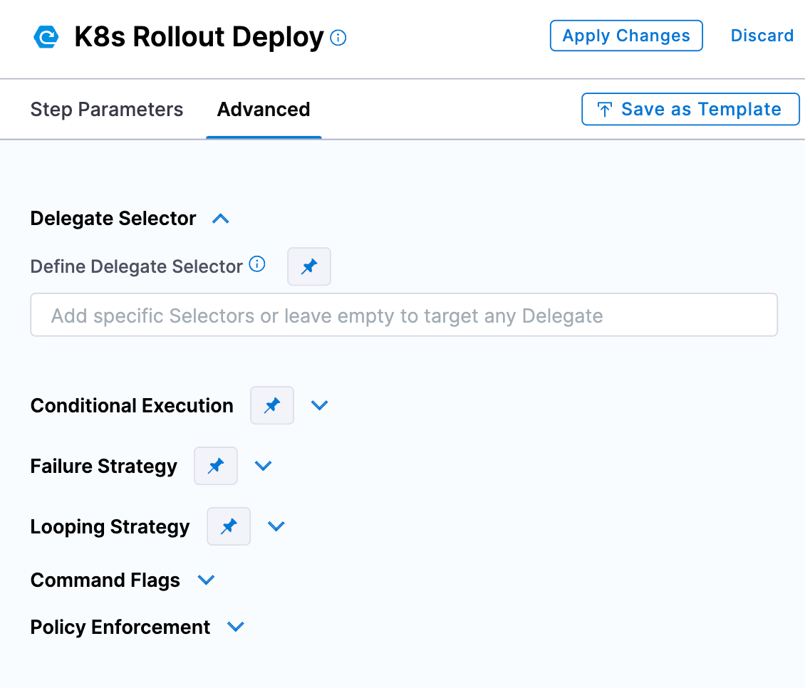 • Pipeline Steps: You can select a delegate in each pipeline step to ensure that the step only uses that delegate to perform its operation.