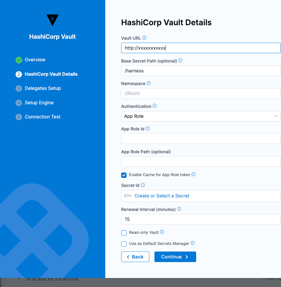 The App Role option enables the Harness Vault Secret Manager to authenticate with Vault-defined roles.