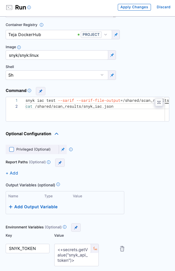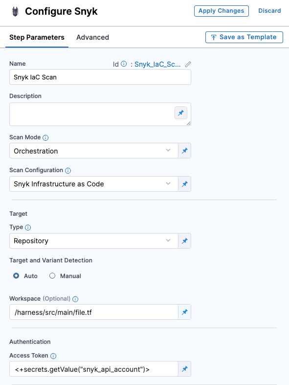 Refer to the Snyk step configuration document to learn more about the fields in the Snyk step and how to configure them.