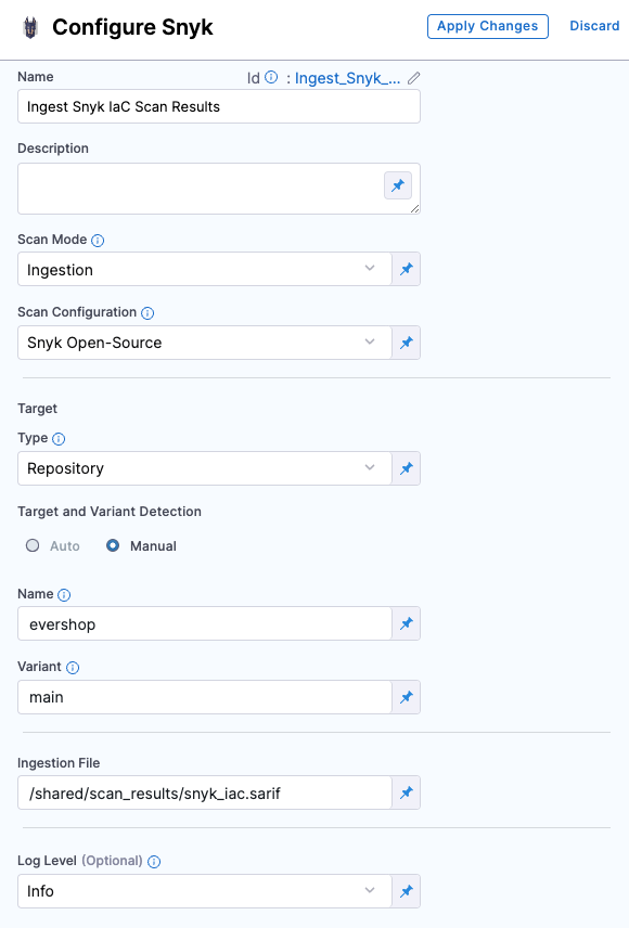 - Ingestion mode: In this mode, the Snyk step reads scan results from a data file, normalizes the data, and deduplicates it.