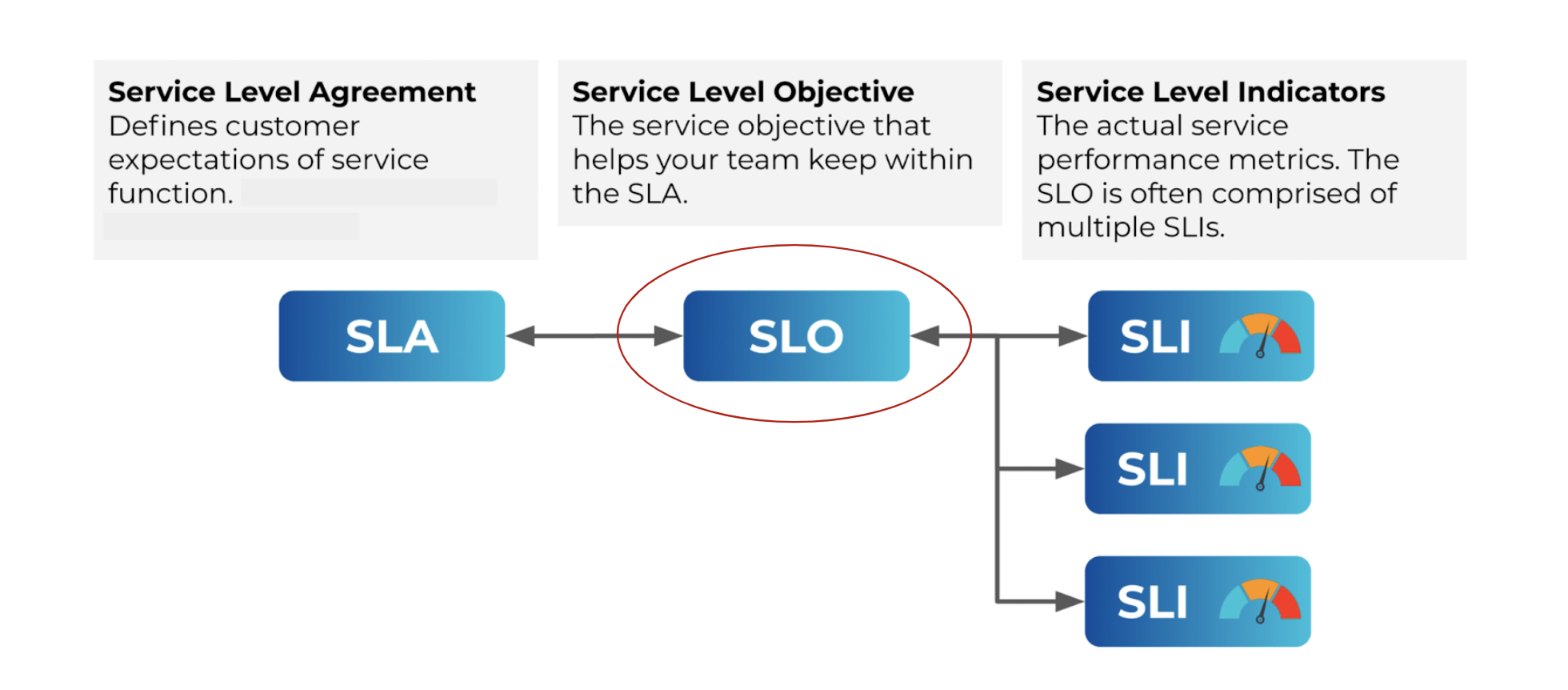 A Service Level Objective (SLO) is an agreed-upon objective or a reliability target value for a system's availability, measured by service level indicator (SLI) metrics. It is the minimum reliability level, in terms of customer expectations, that you expect a service to achieve most of the time. SLOs are reasonable approximation of user experiences which lets you discover the right balance between velocity and quality. For example, consider a scenario wherein a team is consistently meeting its reliability goals, it can increase its velocity of feature releases. However, if the goals are not being met, it results in outages, performance degradation, and so on. The team must then first work on stability and reliability needs before adding new features. SLOs help to balance the possible negative consequences and the lack of availability.