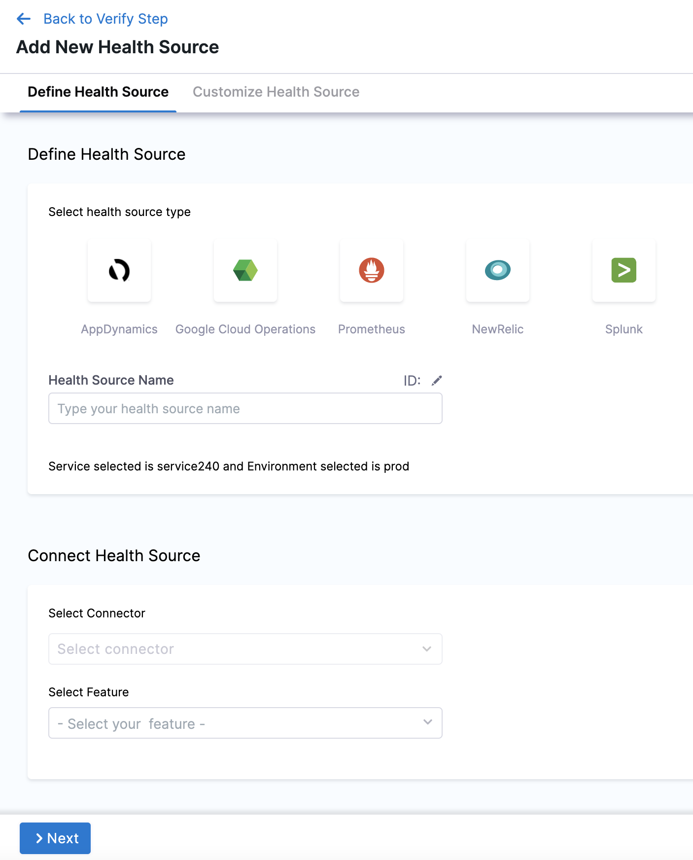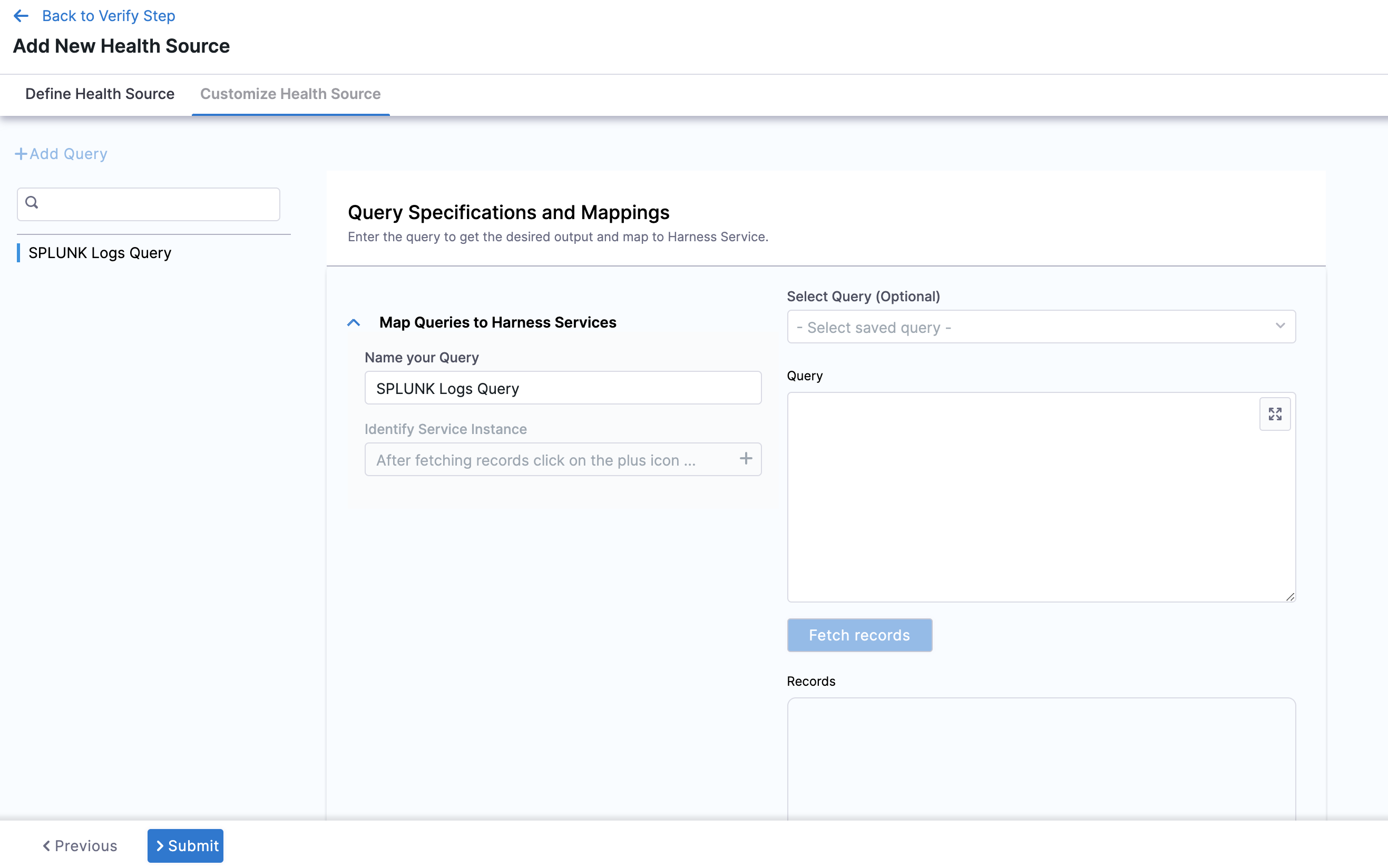 10. Click Next. The Customize Health Source settings appear. The subsequent settings in Customize Health Source depend on the Health Source Type you selected. You can customize the metrics to map the Harness Service to the monitored environment in Query Specifications and Mapping settings.