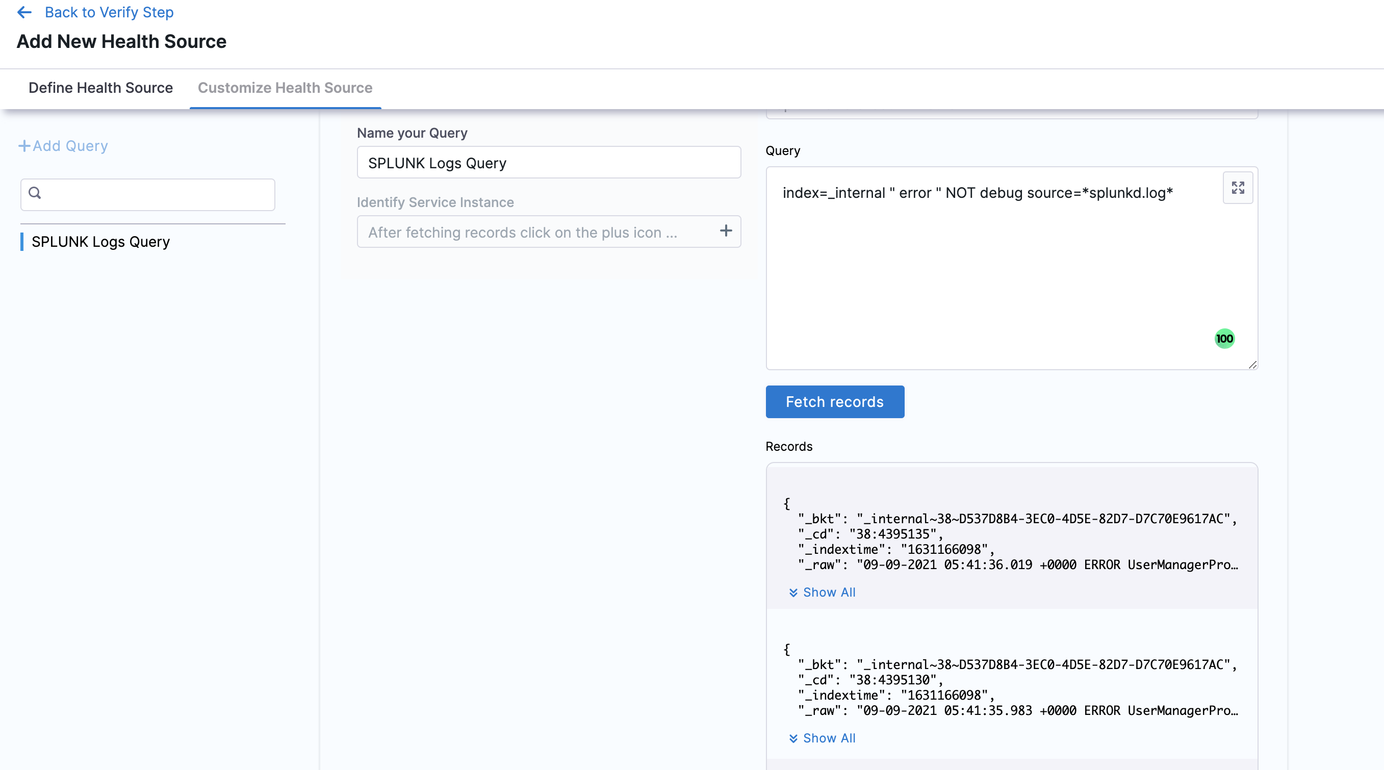 6. Click Submit. The Splunk health source gets added to the monitored service.
