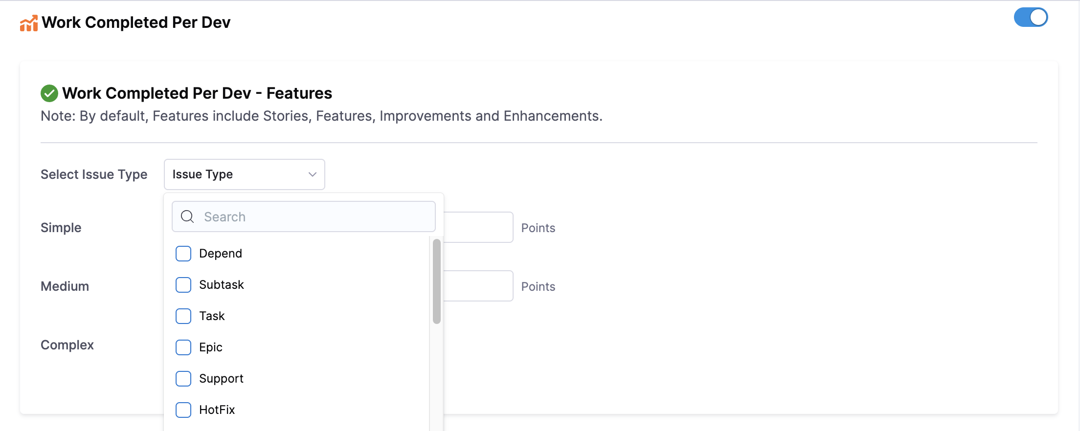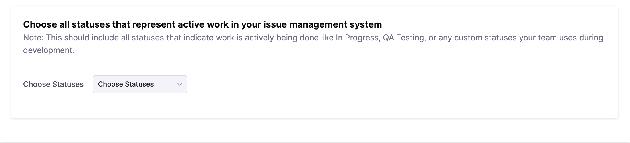 Select statuses from your issue management system that represent development phases (e.g. In Progress, Dev Testing, Ready for QA). This is used to calculate Work Completed Per Dev and contextualize effort timelines in feature delivery for every developer.