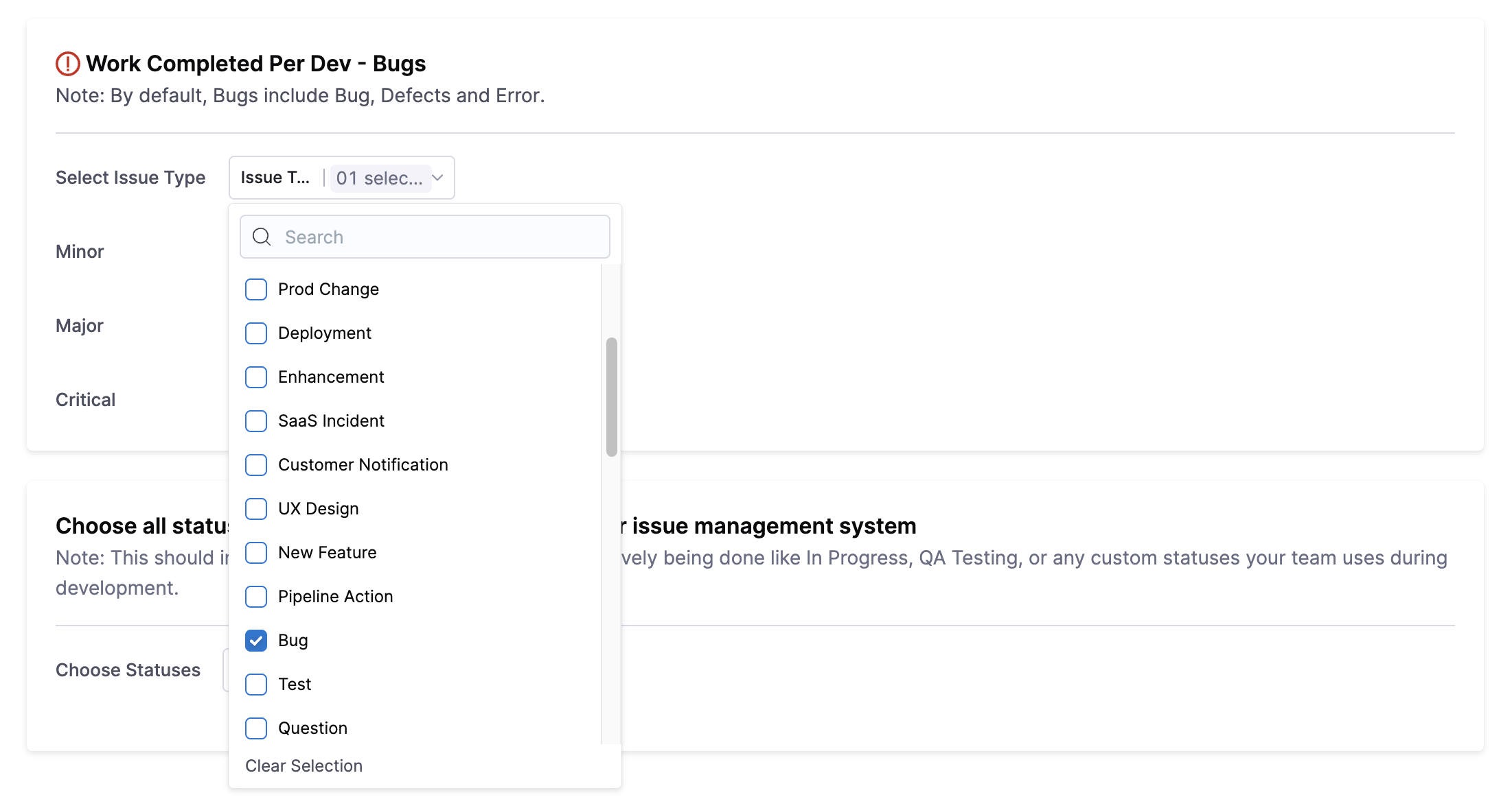 1. Use the dropdown menu to select an issue type or multiple issue types (e.g., Bug).