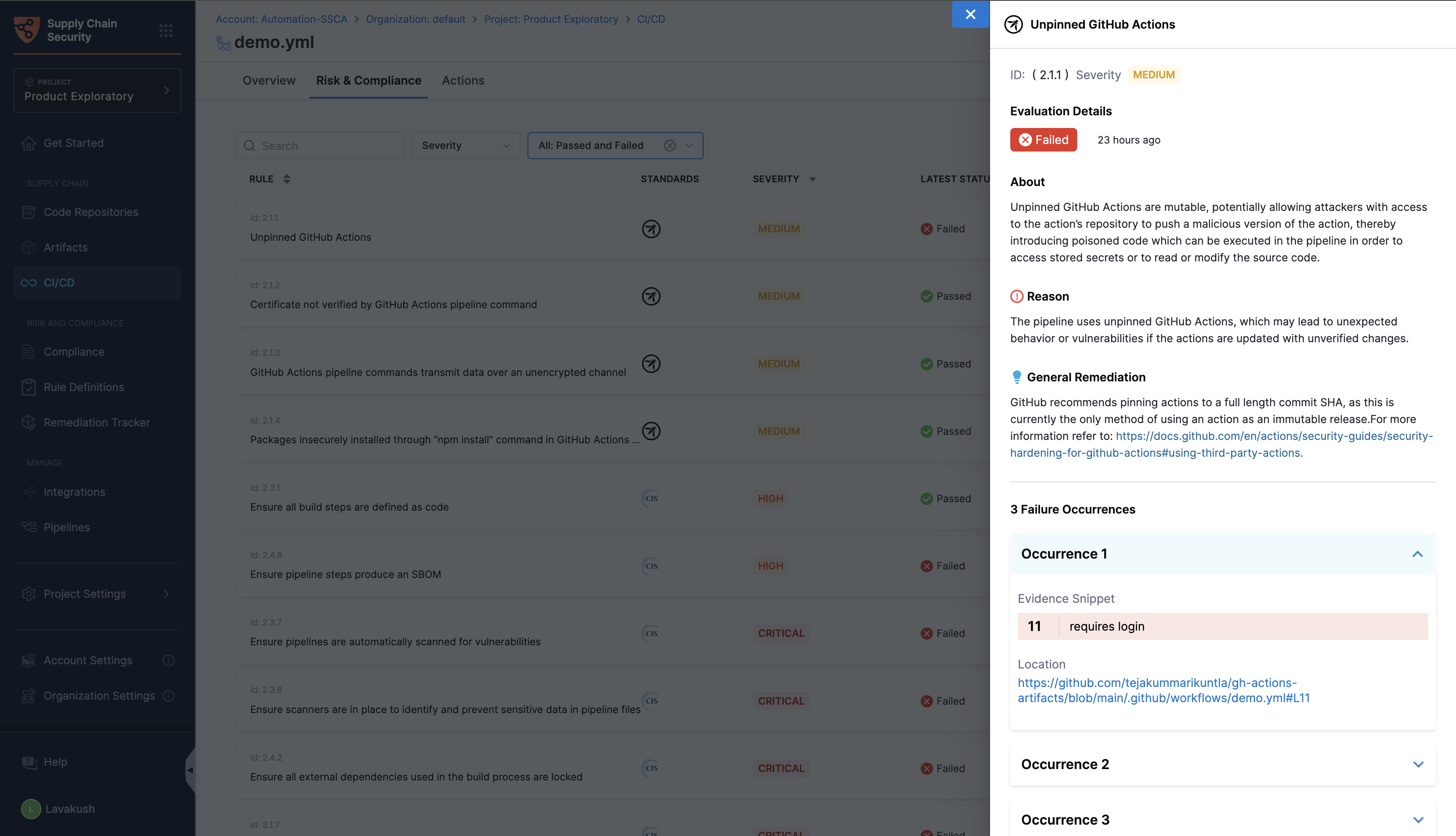 By clicking on a specific evaluation status, you can access detailed information about the rule, including the reason for its failure and general remediation steps to help address the issues identified. Importantly, you can find the failed occurrences list with evidence snippets and the file location.