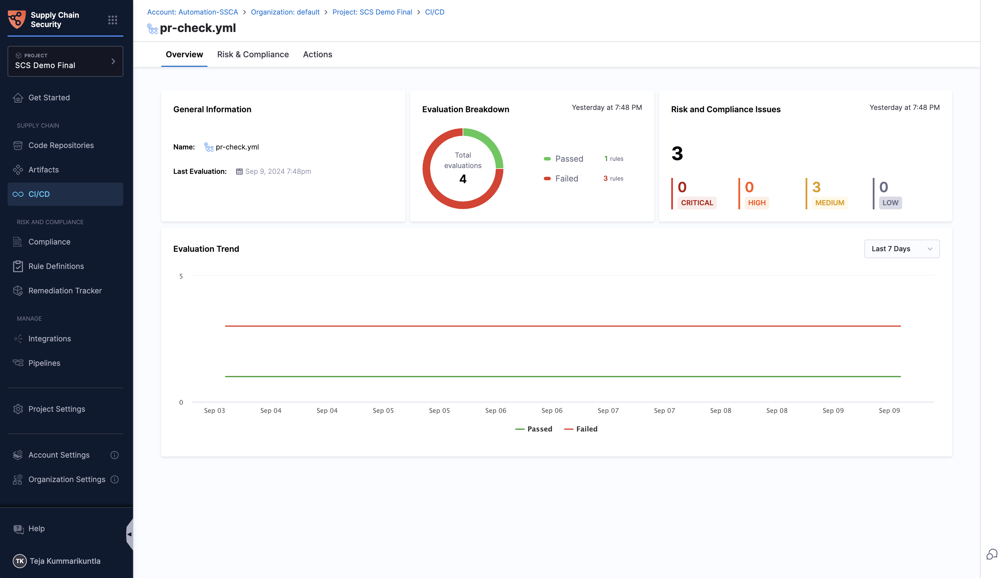 The overview page provides a comprehensive summary of a specific pipeline’s risk posture. This page compiles all the crucial details in one place, offering a clear and concise view.